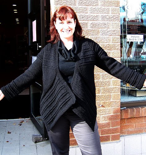 Another sample is off our needles. I totally love this one as well, no surprise there. Knit with seven skeins of Debbie Bliss Chunky Tweed on 7mm needles, it knits up so fast. Each piece could be knit in one evening - so you could have a sweater/jacket in one week! Wow.